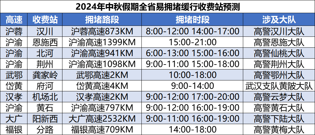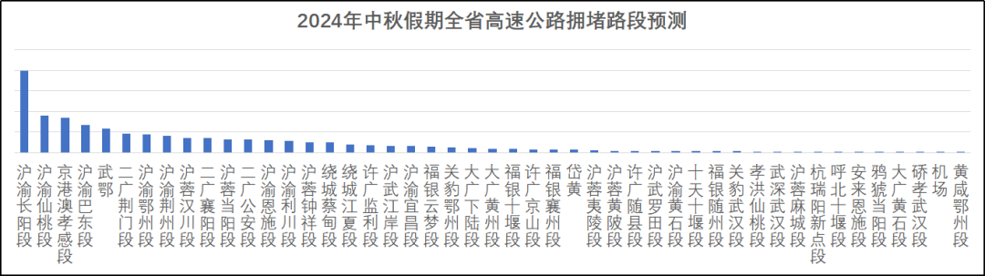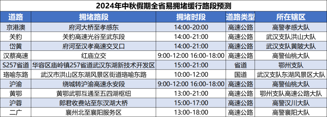 沪渝长阳、巴东、仙桃、荆州、鄂州段,京港澳孝感段,武鄂鄂州段,二广湖北段,沪蓉汉川、当阳段等高速拥堵风险突出。