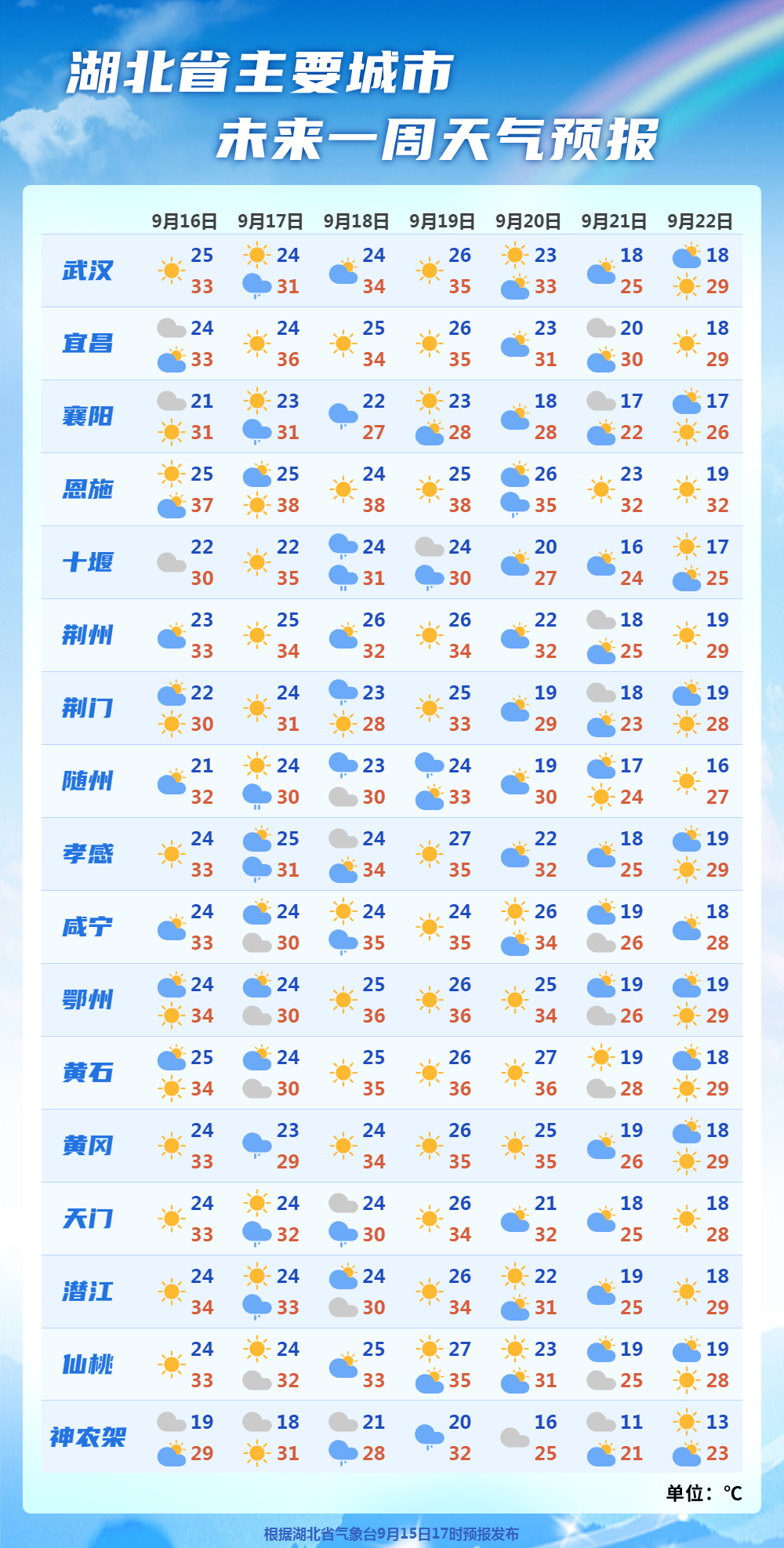 9月18日08时-9月19日08时,鄂西北北部阴天有小到中雨,局地大雨;其他地区多云有分散性阵雨或雷阵雨。最高气温北部27~33℃、南部33~36℃,最低气温21~26℃,偏北风3到4级、阵风5到6级。