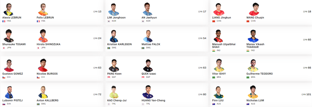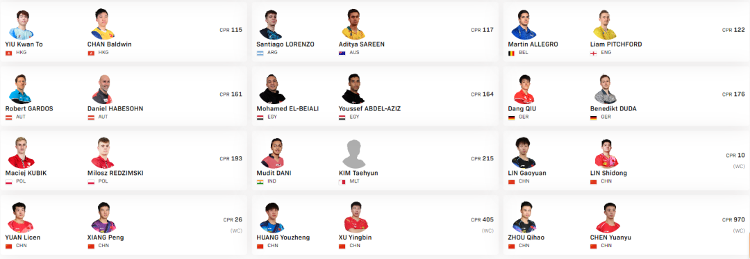 男子双打:正赛24组确认参赛。