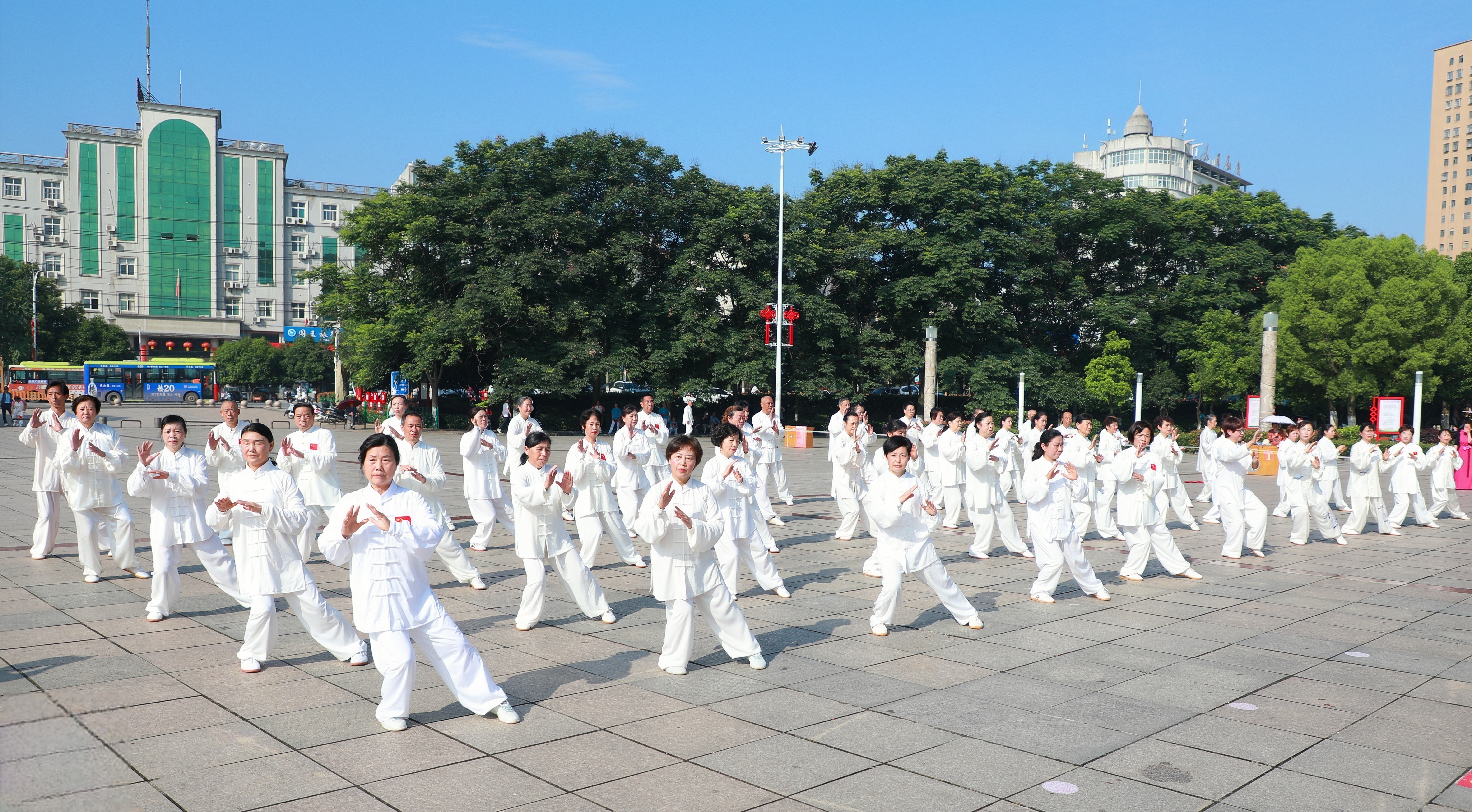 山城脚下、通羊河畔、广场一角……处处都有人们健身、跑步、打太极的身影。