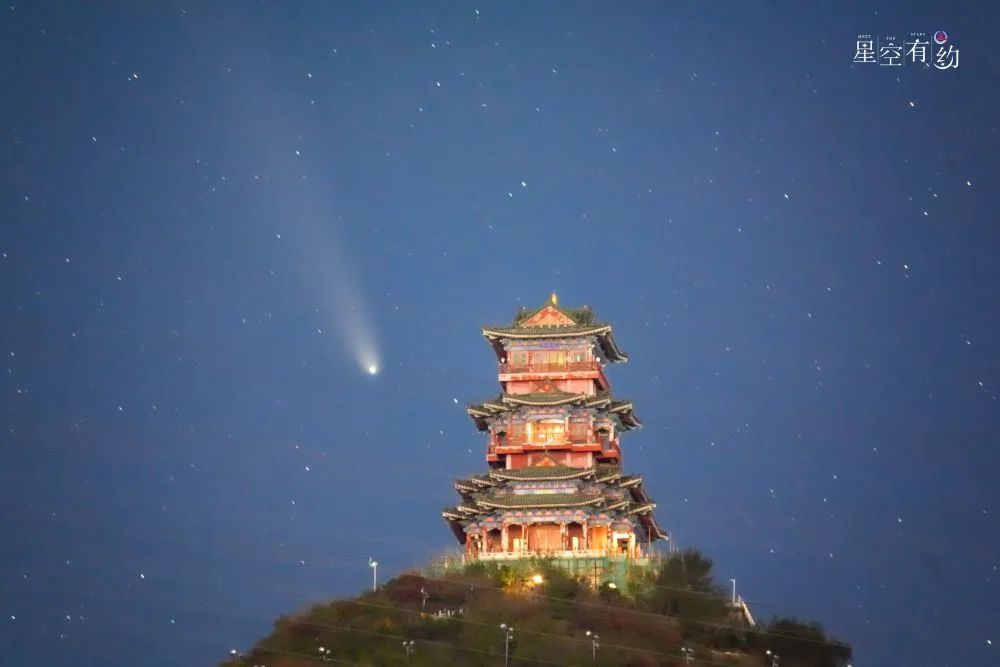 10月22日在北京门头沟区拍摄的紫金山-阿特拉斯彗星与定都阁同框。(王俊峰摄)