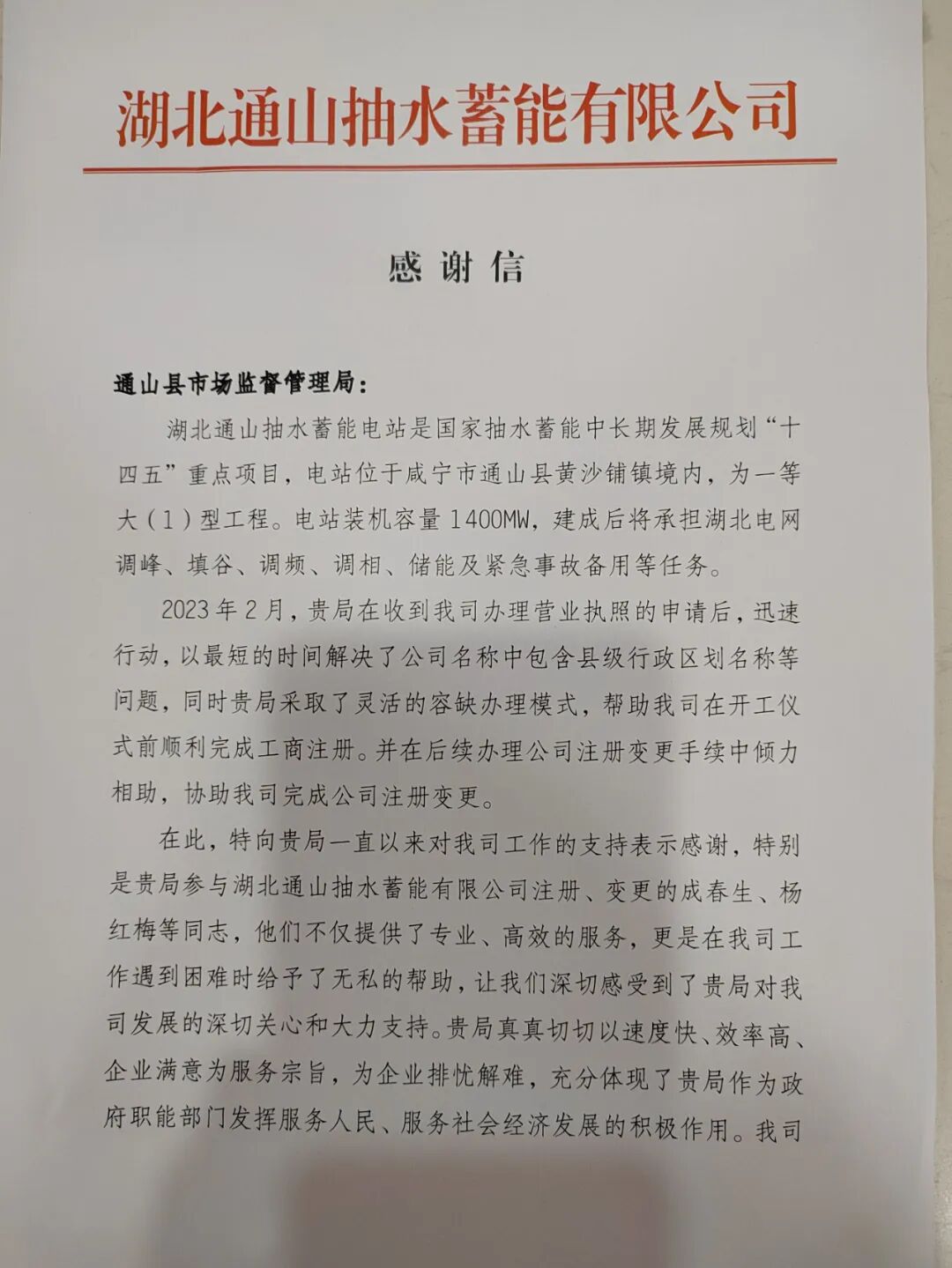 事后,小王十分感激成春生和杨红梅的倾心指导和帮助,于11月6日,向该局寄来了感谢信。湖北通山抽水蓄能电站,是国家抽水蓄能中长期发展规划“十四五”重点项目,位于通山县黄沙铺镇境内,建成后将承担湖北电网调峰、填谷、调频、调相、储能及紧急事故备用等任务。今年 2 月,该局在收到该公司办理营业执照的申请后,在最短的时间内,采取容缺办理模式,帮助该公司在开工仪式前顺利完成公司注册,并在后续变更手续中倾力相助,加班加点帮助该公司完成公司注册变更。11月17日,该公司在“感谢信”中表示:“感谢贵局对湖北抽水蓄能电站项目的关心和支持,特别感谢贵局行政许可股和窗口办事员的专业和无私精神。”