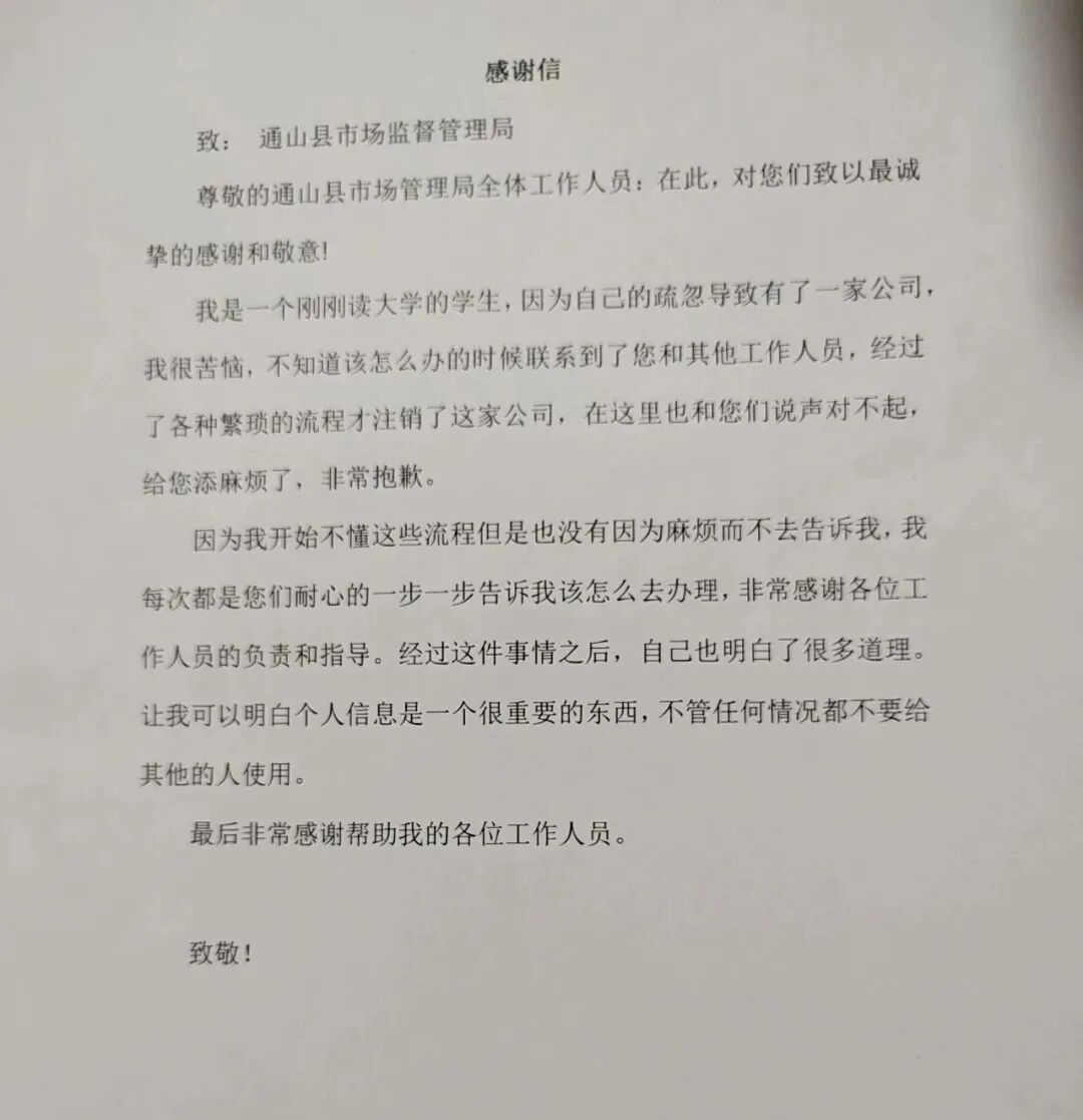 近日,通山县市场监管局接连收到两封群众寄来的“感谢信”,对该局驻政务服务中心窗口工作人员尽职尽责,提供“店小二”式的优质服务表示衷心感谢。2021年12月,内蒙古呼和浩特市青年小王受人蛊惑,身份证被人冒用,在通山注册了一家商贸公司。事后,小王十分后悔,整日提心吊胆,生怕营业执照被不法利用,从而影响自己的个人征信。今年9月,正在上大学的小王,致电通山县市场监管局政务服务中心窗口,咨询注销事宜。得知情况后,该局行政许可股股长成春生通过微信,一边安抚小王的情绪,一边耐心向小王宣讲相关法律知识。窗口办事员杨红梅主动添加小王的微信,耐心细致的教他完成了企业注销的流程。在该局两位工作人员的指导下,小王于今年10月上旬,完成了企业注销事宜。