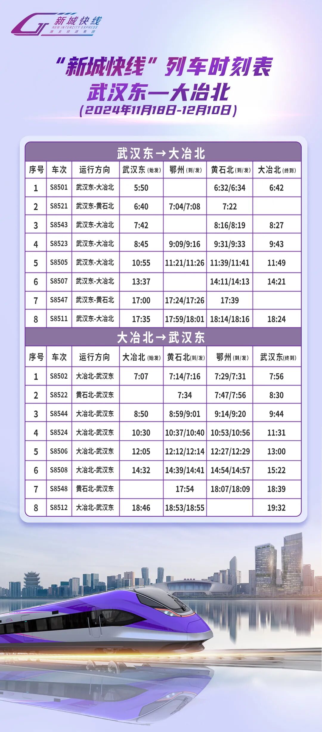 城际铁路武汉/武汉东至大冶北、武汉/武汉东至黄冈西区段城际列车开行也有相应调整。每日开车信息请查询12306官网。