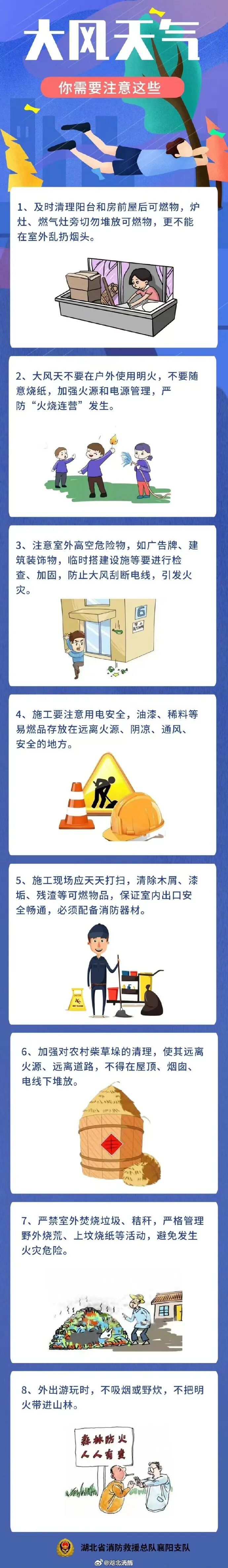 此轮强冷空气来势汹汹,湖北省内大部累计降幅将超过10℃,并伴有大风天气。大家需关注气温变化,及时增添衣物,做好防寒保暖措施。使用取暖设备时需注意用火、用电安全。另外,大风天气出行,不要在广告牌和老树下长时间逗留,注意携带口罩、纱巾等防尘用品,以免沙尘对眼睛和呼吸道系统造成损伤。