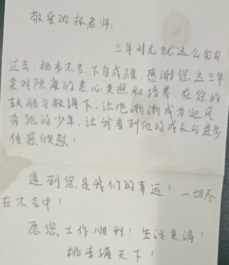 小康同学(化名),乃林老师班上的一名学子,此子聪慧,然而贪玩、自制力欠佳,坐不住板凳,管不住嘴巴,时常违纪,违纪被扣分后还与值日班长争执,甚至出现过几次严重违纪的情况。小康回家后,不翻书本、不写作业,沉迷电子产品,母亲管教他时,还常常与之争吵,甚至发生过数次因与母亲争吵而负气出走或不来上学的情况。林老师的多次开导、促膝长谈,获得了该生的充分信赖。该生每次与母亲争吵负气出走时,只要林老师与他联系,他都会调整好自己的情绪,回到办公室向林老师反映甚至倾诉。2024 届高考,该生以 571 分的佳绩被武汉科技大学录取,该生的母亲也在高考结束便给林老师送来一束鲜花和一张她亲手写的纸条以表谢意。