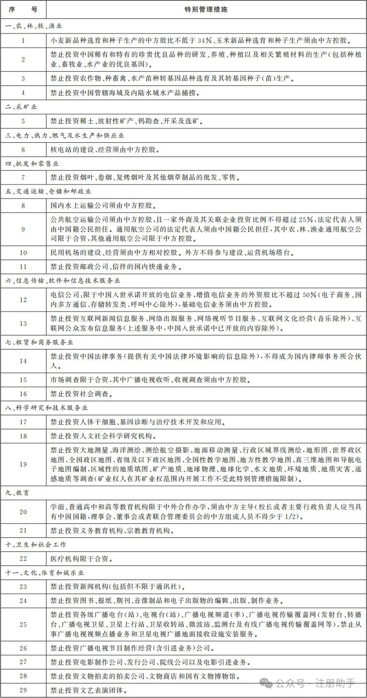一、《外商投资准入特别管理措施(负面清单)》(以下简称《外商投资准入负面清单》)统一列出股权要求、高管要求等外商投资准入方面的特别管理措施。《外商投资准入负面清单》之外的领域,按照内外资一致原则实施管理。境内外投资者统一适用《市场准入负面清单》的有关规定。