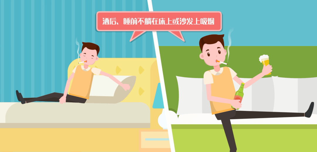 ►不要躺在床上、沙发上吸烟,如临时有其他事情,应确定将烟头熄灭后再离开,如乱扔烟头、在一些禁火地点吸烟或躺在床上吸烟,很容易引发火灾事故。