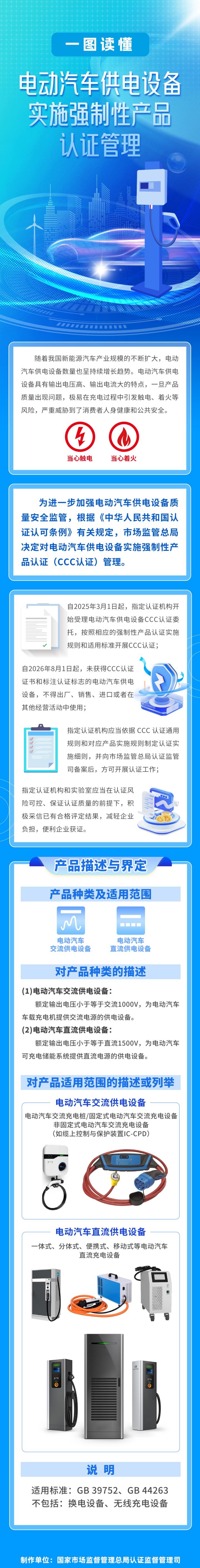 市场监管总局12月16日宣布对电动汽车供电设备实施强制性产品认证(CCC认证)管理。自2025年3月1日起,开始受理认证委托;自2026年8月1日起,未获得CCC认证证书和标注认证标志的电动汽车供电设备,不得出厂、销售、进口或者在其他经营活动中使用。
