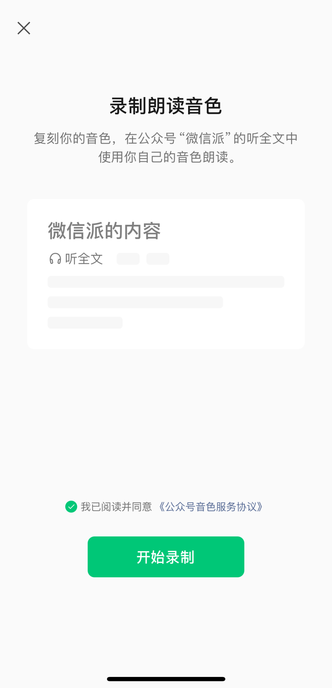 据微信派公众号消息,微信最近上线了“作者朗读音色”新能力,用户点击“听全文”,就能够“听”到作者音色朗读的公众号文章。