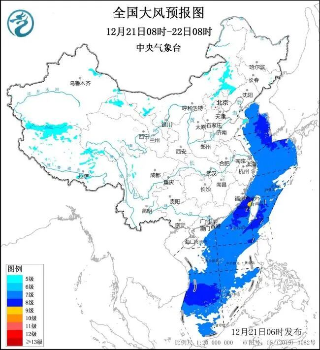 预计,12月21日08时至22日08时,新疆山口地区、西藏北部和东部、青海南部、川西高原、甘肃西部、内蒙古东部、河北北部、辽东半岛、山东半岛等地部分地区将有5~6级、阵风7~8级的大风;黄海大部海域、东海大部海域、台湾海峡、台湾以东洋面、巴士海峡、南海大部海域将有7~8级、阵风9~10级的大风,其中台湾海峡风力可达9级、阵风10~11级。