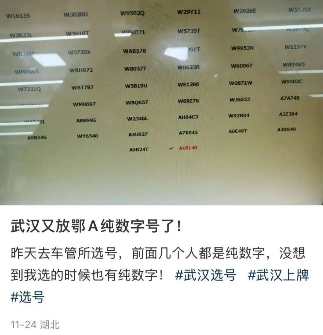 有网友在社交平台上分享的一则选号牌经历引发较大反响。这位网友于11月23日在车管所选机动车号牌时,选到了一个鄂A的纯数字号牌。