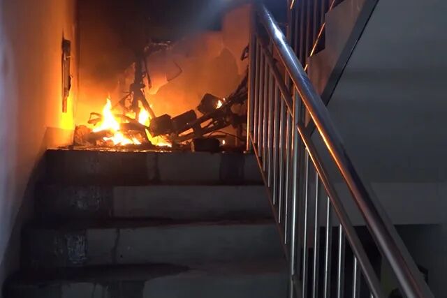 楼道内的电动自行车燃烧后危险性成倍增加,因电动自行车车身、围挡、坐垫普遍采用高分子可燃材料,起火后90秒温度可达200摄氏度,120秒后电动车开始爆炸,浓烟将会笼罩整个楼道,会释放大量有毒烟气,并迅速蔓延,短时间内就会致人中毒窒息死亡。