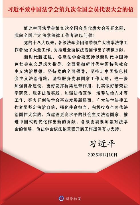 新华社北京1月10日电 在中国法学会第九次全国会员代表大会召开之际,中共中央总书记、国家主席、中央军委主席习近平致信大会,向全国广大法学法律工作者致以问候,并对做好法学会工作提出希望。