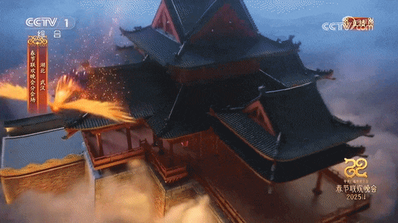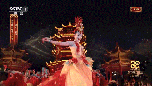 春晚主舞台之一的黄鹤楼,用高科技光影技术让这座千年名楼“炫”起来,飞檐斗拱间,光影交织、变幻无穷。节目渐进高潮尾声,黄鹤楼上,鼓阵齐鸣,凤凰图腾涅槃重生,见证着千年古城在新时代的浪潮下的时尚蜕变。整个舞台像层叠的“蛋糕”塔,6余米高,演员们一层层围绕着中心主演舞动。