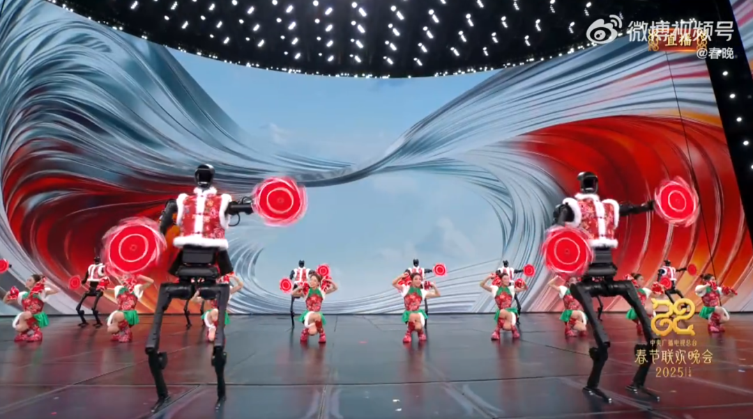 在由张艺谋导演,杭州宇树科技、新疆艺术学院联合表演的创意融合舞蹈《秧BOT》节目中,人形机器人跳起了秧歌舞,丢起了手绢。