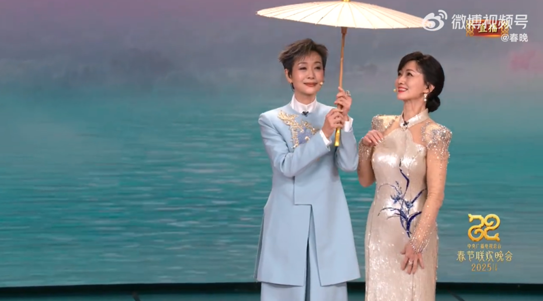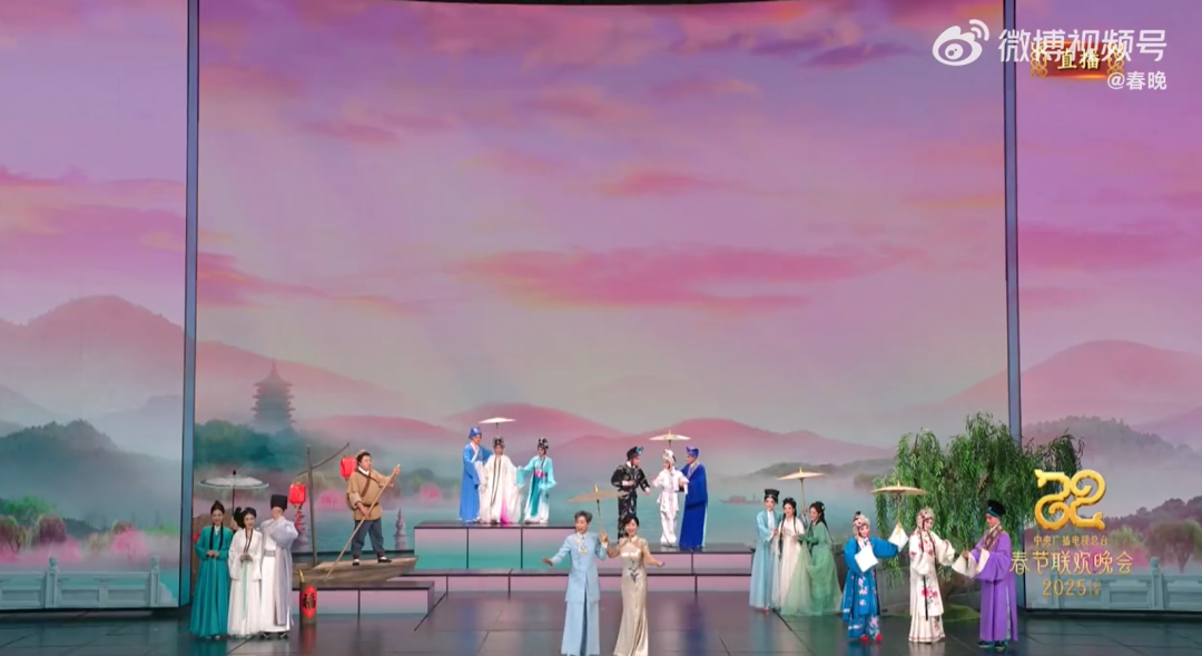 小品《借伞》围绕《白蛇传》中“断桥借伞”的经典桥段,巧妙串联京剧、粤剧、川剧、越剧四个剧种,最后还有赵雅芝叶童春晚合体。