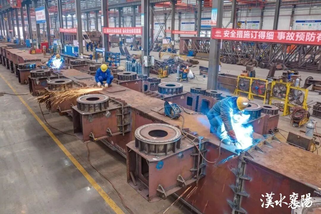 汉江重工装备制造厂内60余名工人已经紧锣密鼓地开工赶制门座式起重机和悬灌造桥机的生产订单