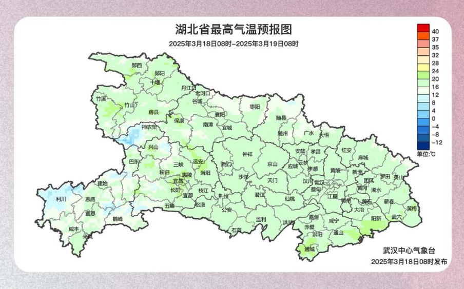 昨天(17日)湖北省内大部为晴到多云的天气,仅恩施地区局部出现小雨,大部地区气温较前一日有所上升,最高气温在14~19℃。不过,今早湖北省气温低迷,北部最低气温仅-1~2℃,南部在2~5℃。