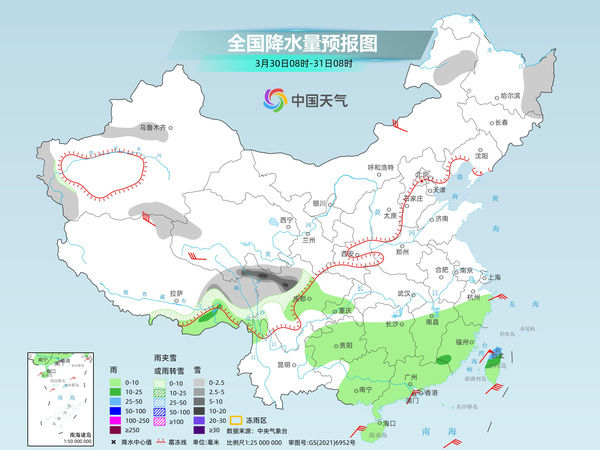 中央气象台预计,今天,东北地区东部、新疆沿天山地区西部、西藏东部、川西高原北部等地部分地区有小雪或雨夹雪。西藏东部、江南、西南地区东部和北部、华南、台湾岛大部等地部分地区有小到中雨,其中,西藏东南部、江西南部、福建南部、广东北部和西部等地部分地区有大雨。