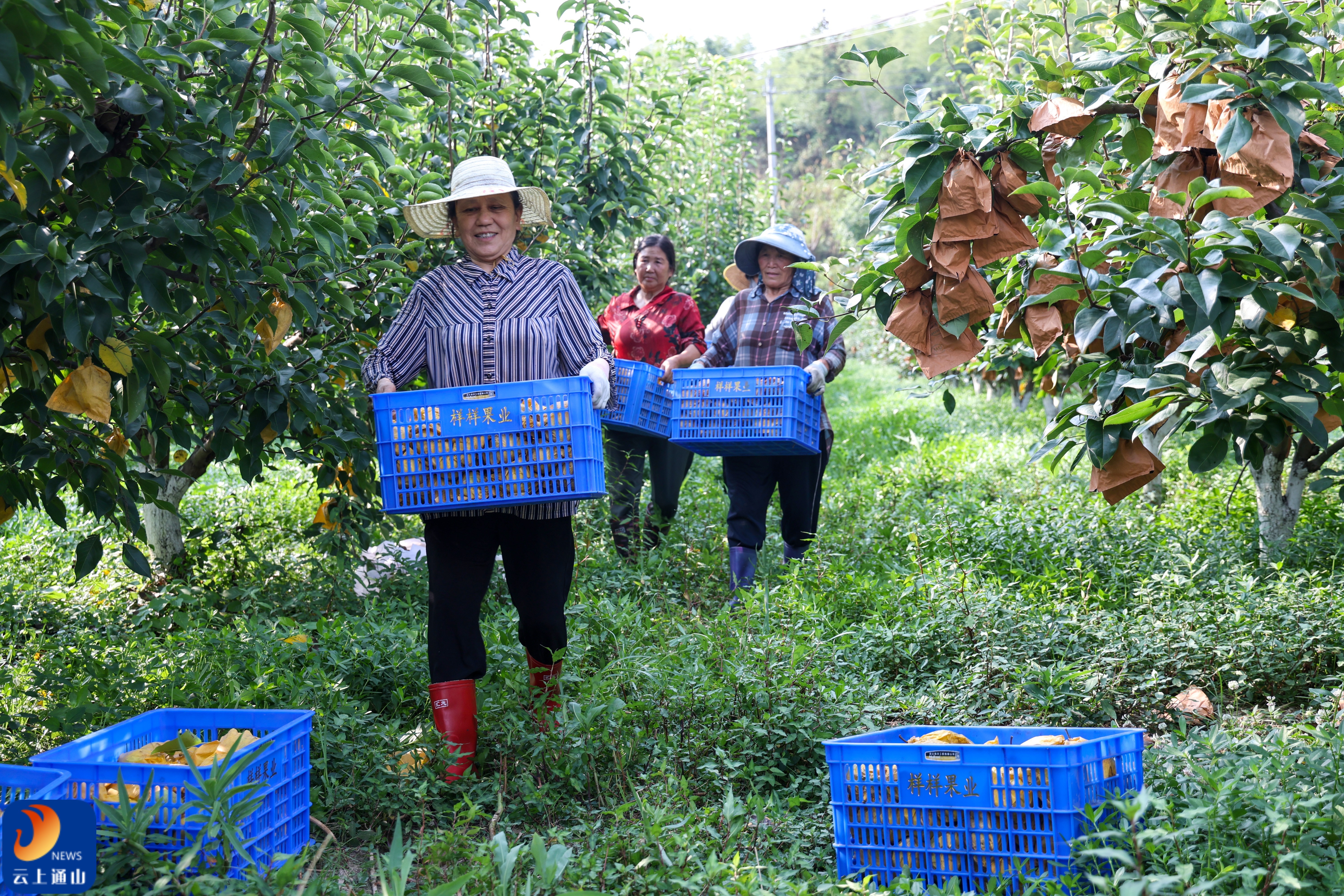 ▲果农穿梭其间,脸上洋溢着喜悦,手中的篮子装满,洋溢丰收欢畅。