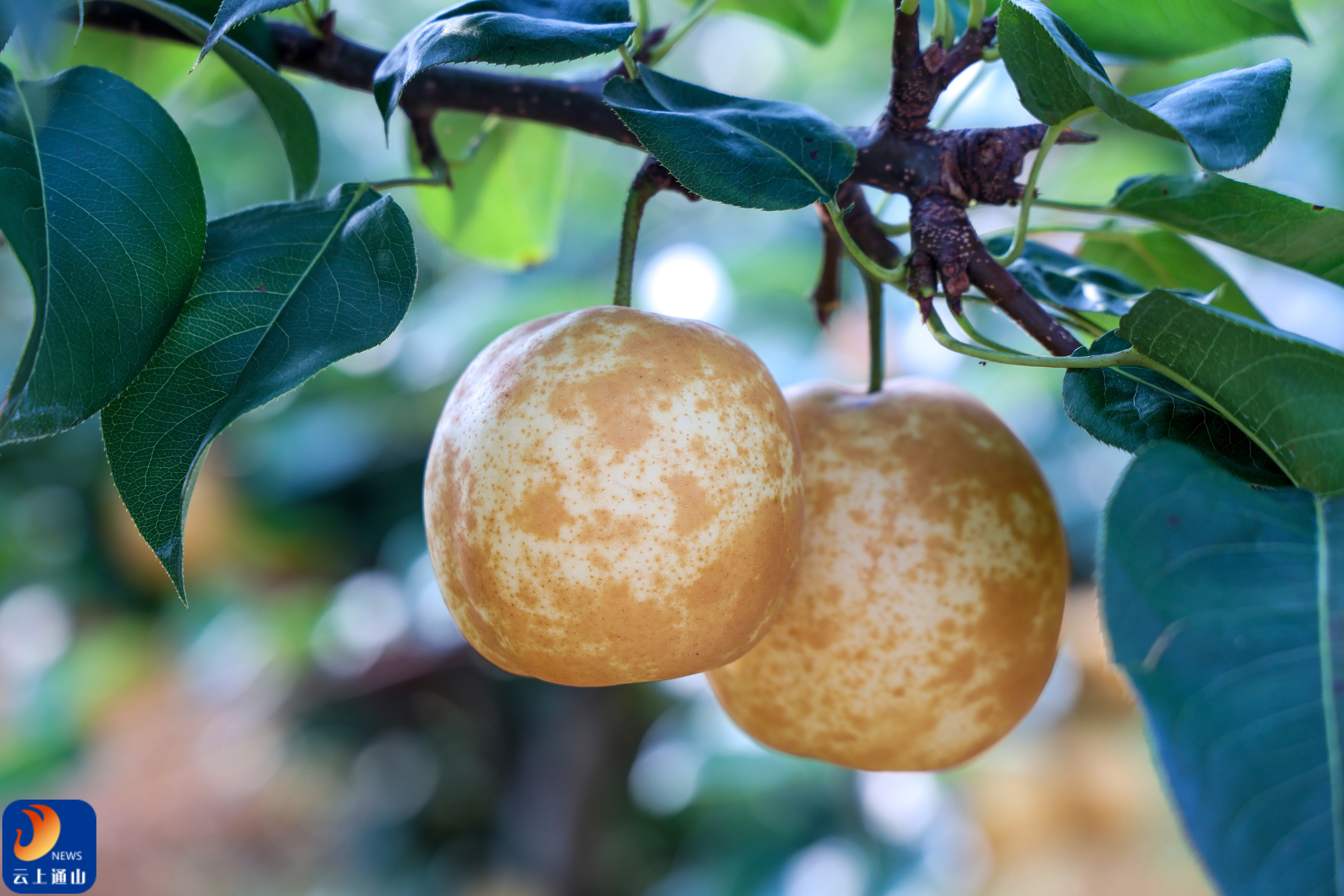 ▲果园里,黄澄澄的梨子挂满枝头,压弯了树枝,散发诱人光泽。