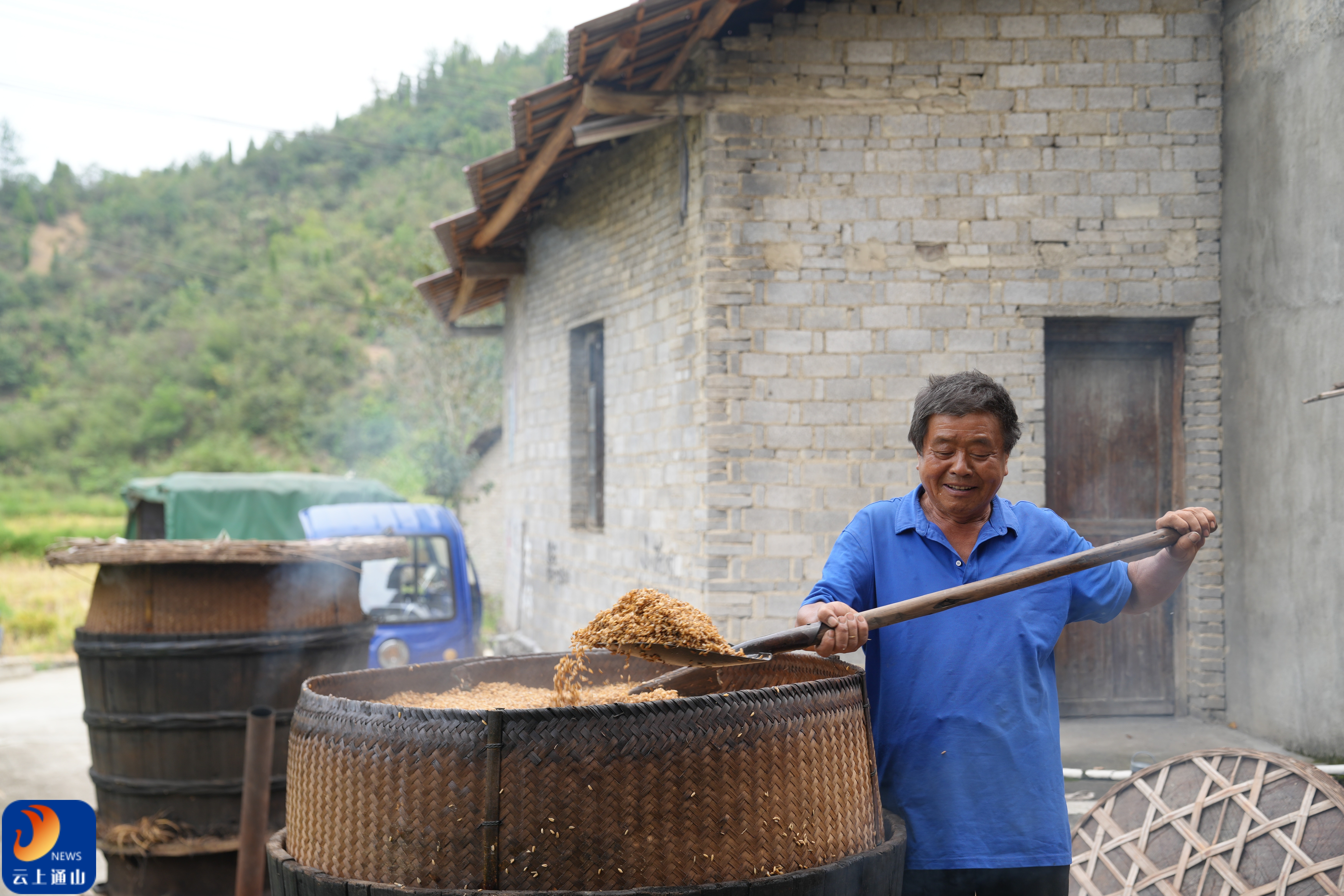 丰收的稻谷在马桥村被赋予了更丰富的内涵。一部分经过现代化加工设备,蜕变为晶莹剔透、品质上乘的优质大米,另一部分稻谷用于酿造醇香美酒。在马桥村五组,65岁的村民马立富从祖辈传承了传统古法酿酒手艺,每年丰收季都会到村民家酿酒。“一年大概要给村里酿几千斤酒,收入有几万元。”马立富手拿铁铲边搅边说。