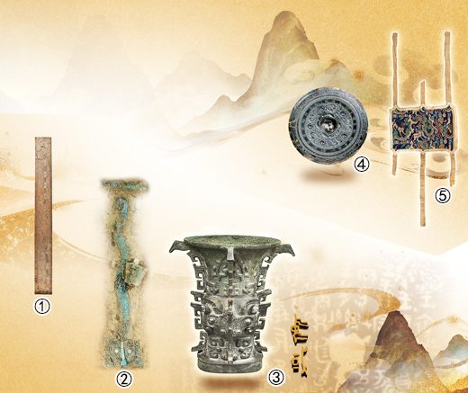 图①:山西襄汾陶寺遗址出土圭尺。中国社会科学院考古研究所供图 图②:河南偃师二里头遗址出土绿松石龙形器。中国社会科学院考古研究所供图 图③:陕西宝鸡青铜器博物院藏何尊及其铭文“中国”。陕西宝鸡青铜器博物院供图 图④:湖北武汉博物馆藏五乳神兽镜。湖北武汉博物馆供图 图⑤:新疆维吾尔自治区博物馆藏“五星出东方利中国”汉代织锦护臂。新疆维吾尔自治区博物馆供图
