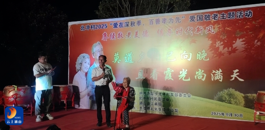 云上通山报道:(通讯员 钱希)9月30日,在国庆节来临前夕,燕厦乡北冲村石木地广场张灯结彩、人头攒动,一场以“爱在深秋季 百善孝为先”为主题的爱国敬老主题活动在此隆重举行。北冲村两委干部、村民组长与80岁以上老人共聚一堂,通过集体生日晚宴、文艺表演等形式传递孝老敬亲的传统美德,共同迎接祖国华诞。