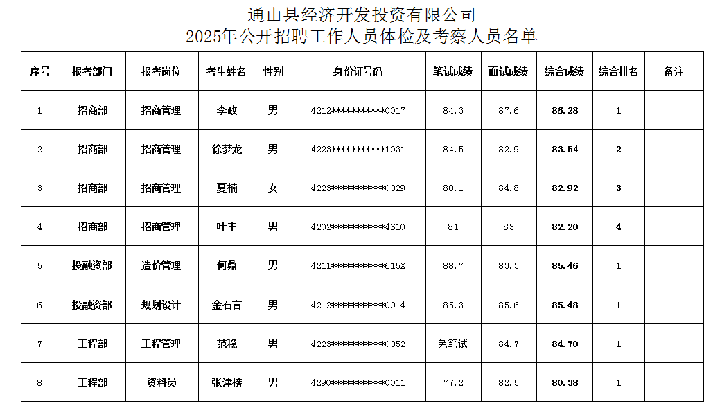 1.通山县经济开发投资有限公司2025年公开招聘工作人员体检及考察人员名单