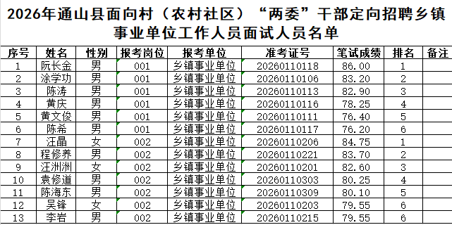 为深入贯彻落实中央及省市县委关心关爱基层干部的部署要求,进一步拓宽基层干部上升渠道,优化乡镇事业单位干部队伍结构,夯实乡村振兴人才基础,根据《通山县2026年面向村(农村社区)“两委”干部定向招聘乡镇事业单位工作人员工作实施方案》要求,经招聘工作领导小组研究同意,现将本次面试相关事宜公告如下: