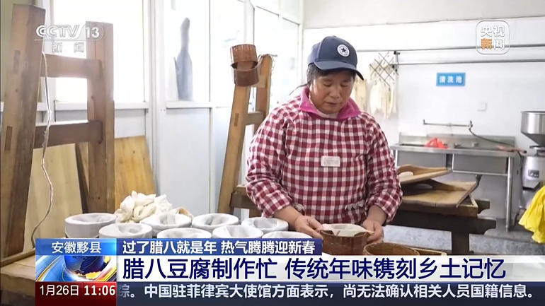 腊八节前,在黟县西递镇石印村,天刚亮,豆腐工坊的师傅们已经忙碌起来。他们要做的不是普通豆腐,而是黄山的特色美食——腊八豆腐。先将精选黄豆充分浸泡后磨浆熬煮,滤去豆渣制成细腻嫩滑的豆腐花,再按比例调入特制的八角水与鲜香辣椒末。经过充分搅拌后,把拌匀的豆花盛入棉布袋中,再扎紧袋口,按照固定的方向反复揉搓、用力捶打,挤出豆花中多余的水分。