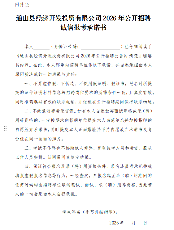2、通山县经济开发投资有限公司2026年公开招聘诚信报考承诺书