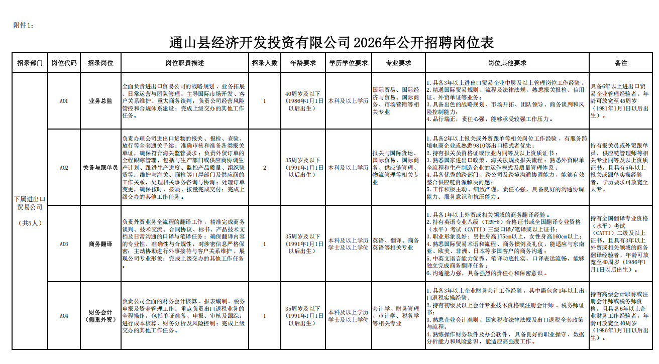 具体岗位及要求详见附件1《通山县经济开发投资有限公司2026年公开招聘岗位表》,以下简称《岗位表》。