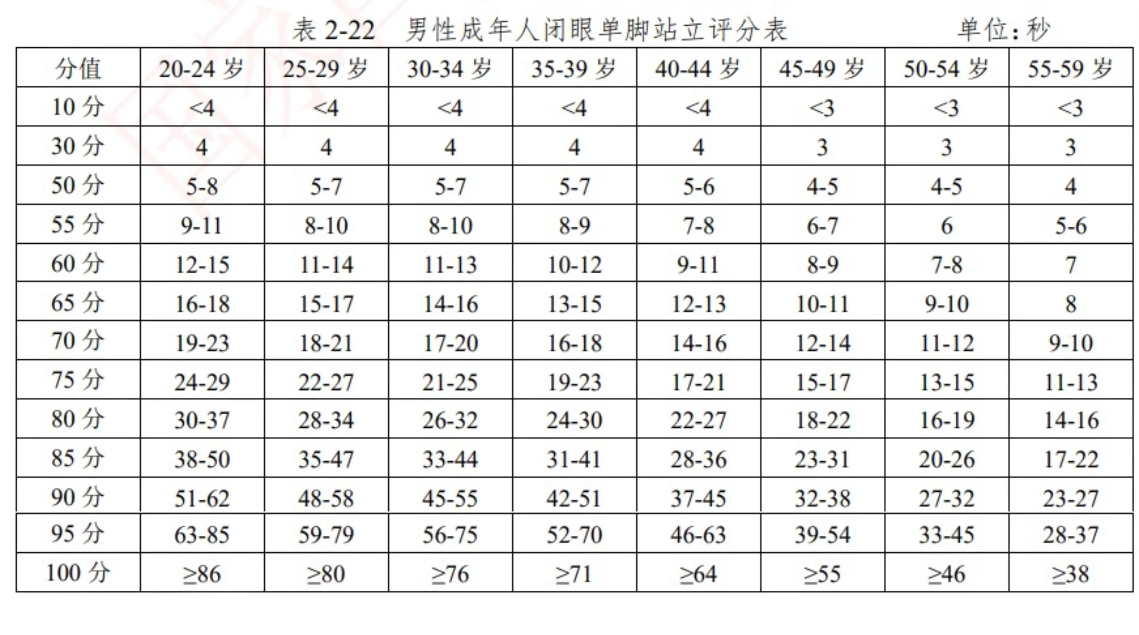 衡量标准:一般来说,成年女性闭眼单腿站立时应当超过12秒,成年男性超过13秒,且时间越长代表身体越年轻。如果不是闭眼进行,单腿站立30秒也是合格水平。