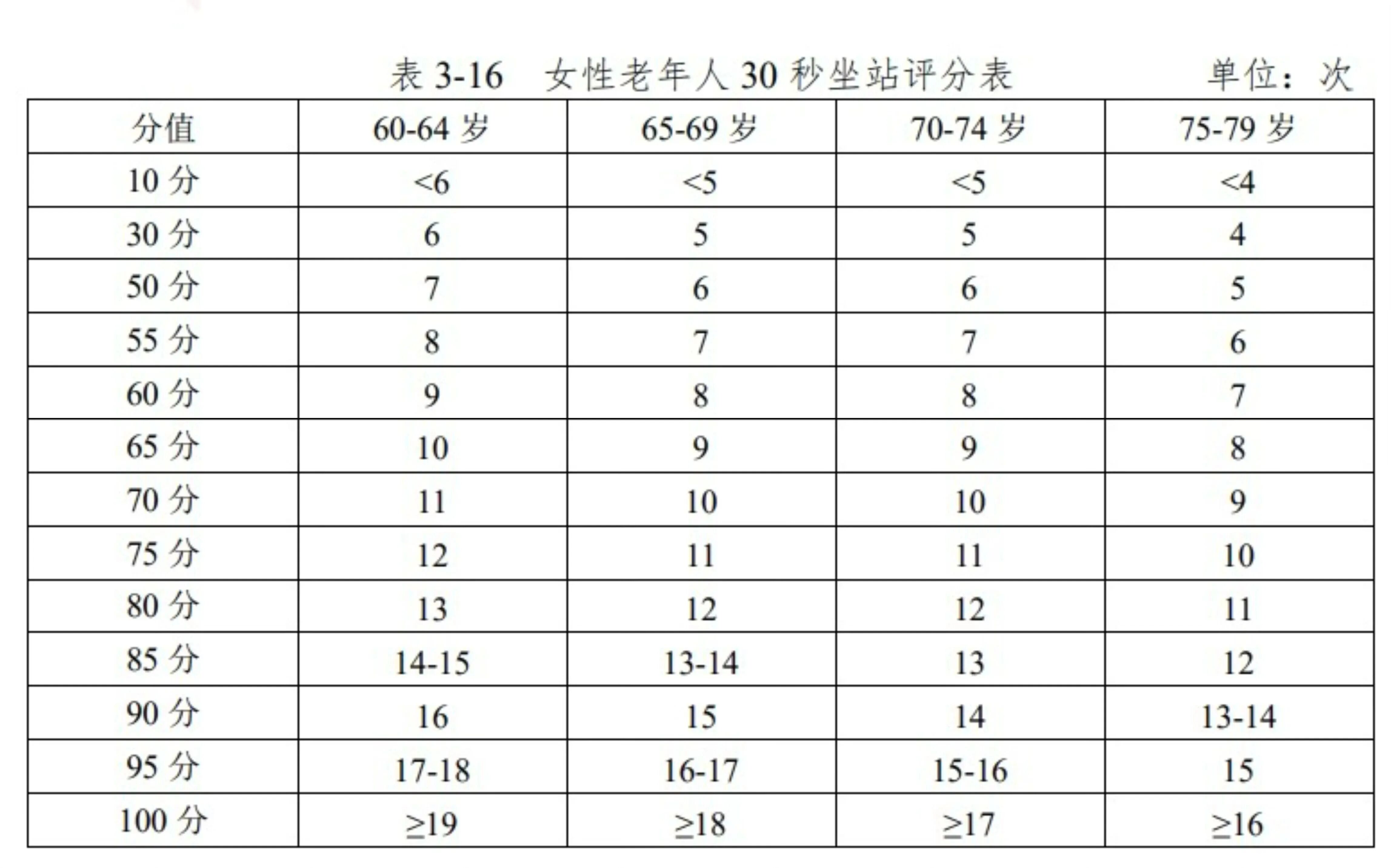 《国民体质测定标准(2023 年修订)》中,30秒坐站测试被列入60~79周岁的老年人测试项目,可对照自查。