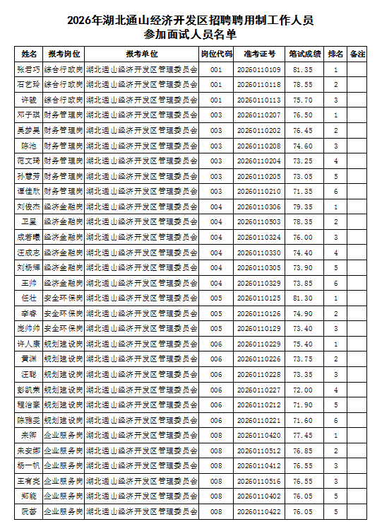 为做好2026年湖北通山经济开发区聘用制工作人员公开招聘面试工作,根据《2026年湖北通山经济开发区招聘聘用制工作人员工作方案》文件精神,为确保面试工作严谨有序、客观公正进行,现将面试工作有关事项公告如下: