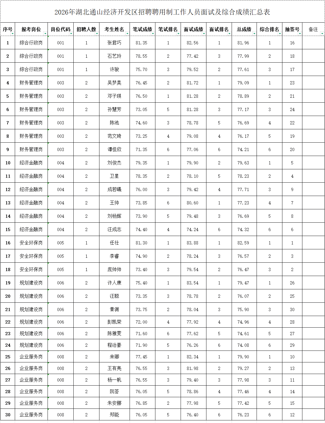 附件:2026年湖北通山经济开发区招聘聘用制工作人员面试及综合成绩汇总表