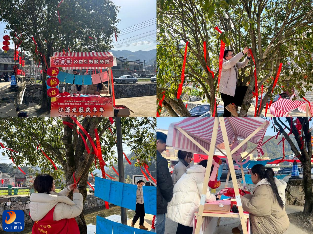 云上通山报道:(通讯员 谢明哲)2月11日,农历腊月二十四南方小年,“悦见咸宁·2026来咸过大年通山赶集活动”之洪港镇江源村春节民俗文化活动在古民居群热闹启幕。洪港镇团委、镇妇联携手在祈愿树(月老树)下,创新推出“红娘站+新春祈愿”融合活动,将公益交友服务与新春祈福仪式相融合,为传统年俗注入浪漫温情,让古村年味更有质感、更贴民心。