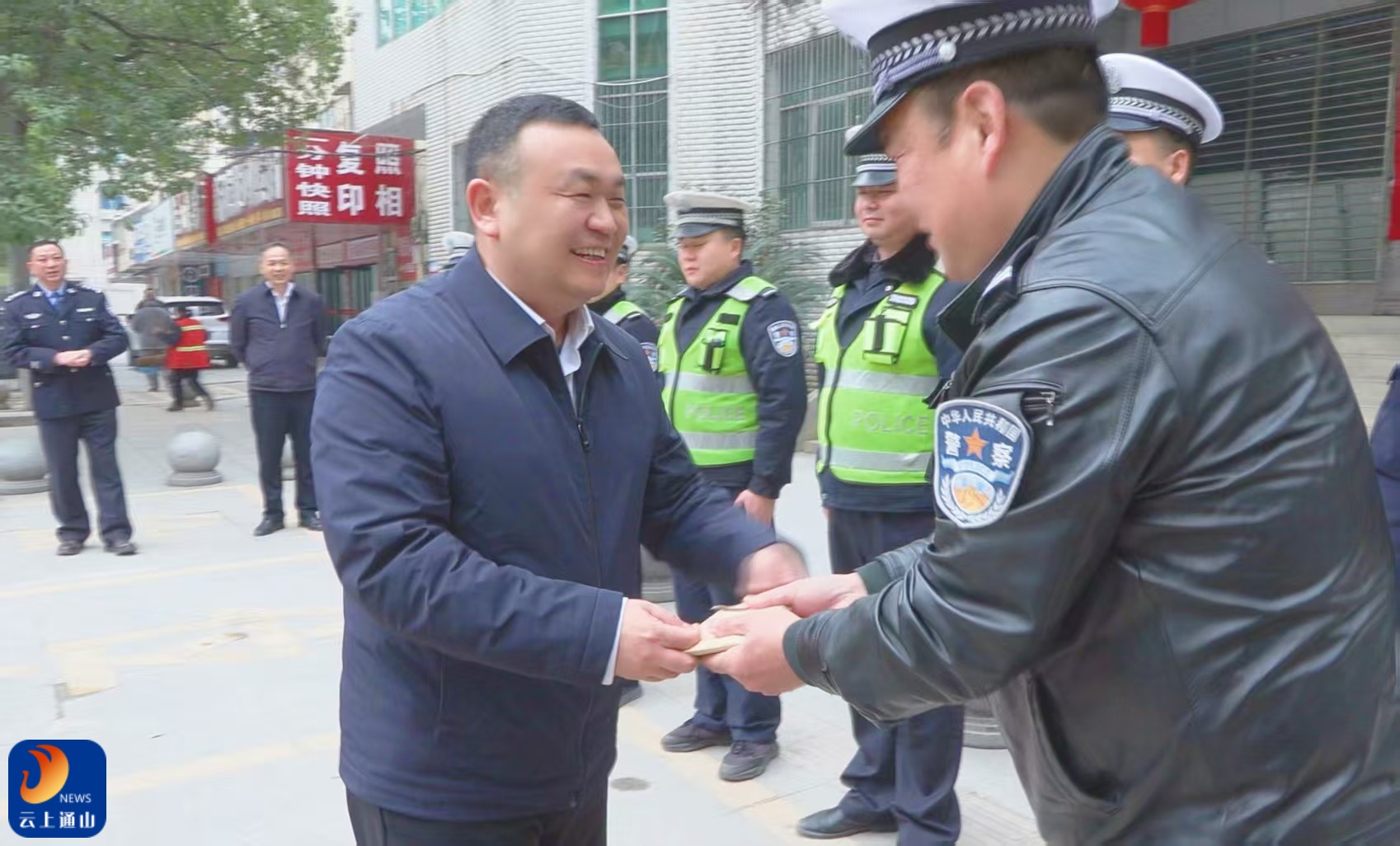 ▲王功辉等县领导和交管大队民辅警亲切交流。