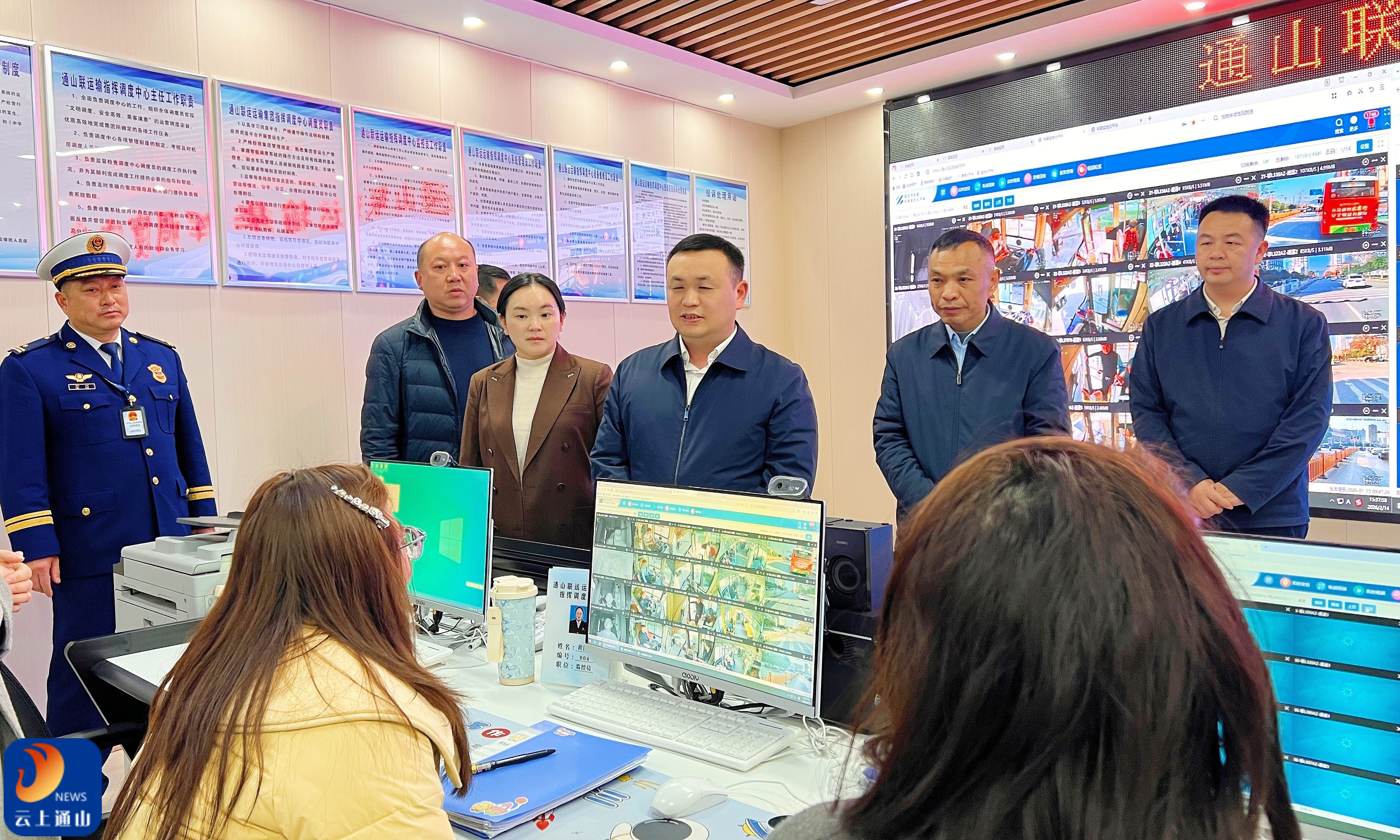 ▲王功辉重点查看视频监控室,详细了解车辆动态监控和驾驶员安全监管情况。