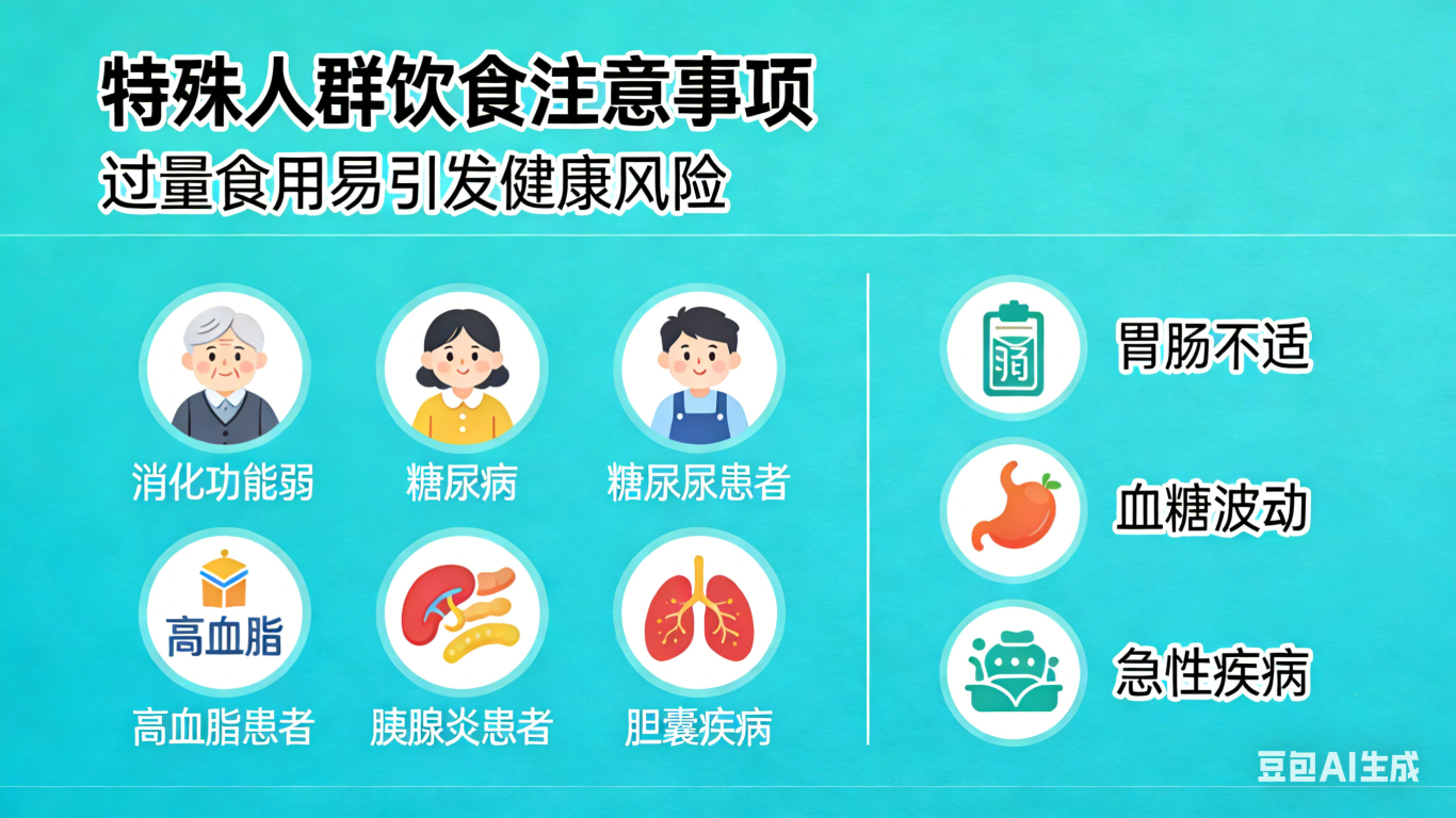 糖尿病患者/高血脂患者: 建议浅尝辄止,1-2颗解解馋即可,并需严格扣除相应的主食量,同时监测餐后血糖。