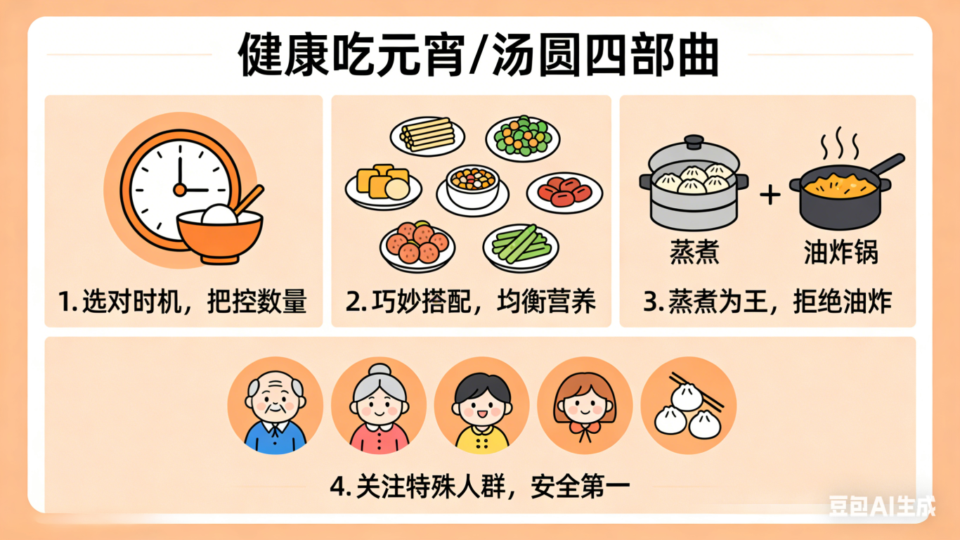 搭配“原汤”: 正所谓“原汤化原食”。煮元宵或汤圆的水中含有一些糯米粉,喝点温热的原汤可以促进消化液分泌。但注意,如果是甜汤或经过多次煮制变浑浊的汤,就不要喝了。