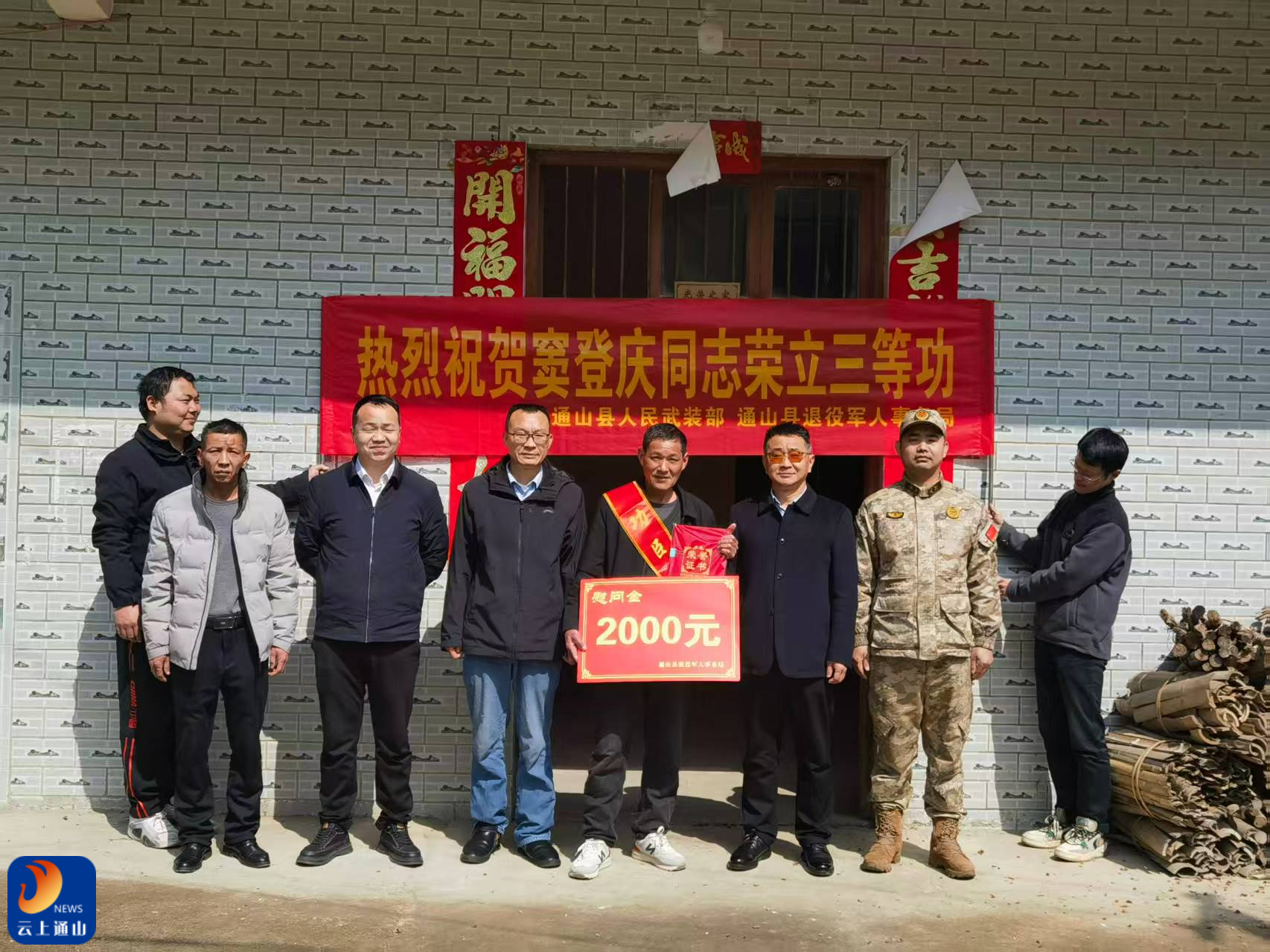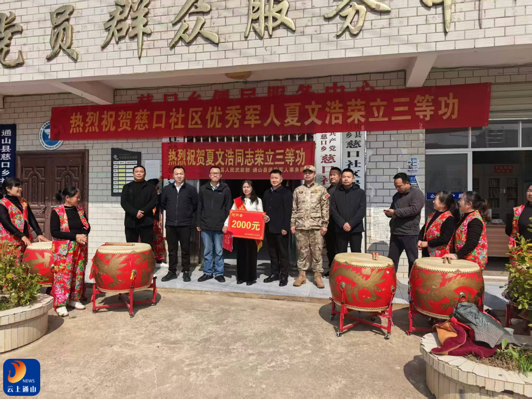 云上通山报道:(通讯员 朱澄熙)锣鼓喧天送喜报,拥军优属暖人心。3月10日上午,慈口乡党委、政府组织立功现役军人家属、干部群众,架起锣、打起鼓,迎接县人武部、县退役军人事务局联合慰问组的到来。慰问组带着立功喜报、慰问金和新春祝福,走进慈口乡慈口社区、乌岩村,为荣立三等功的现役军人家庭送去荣誉与关怀,让“一人立功、全家光荣”的自豪感传遍乡野村落。