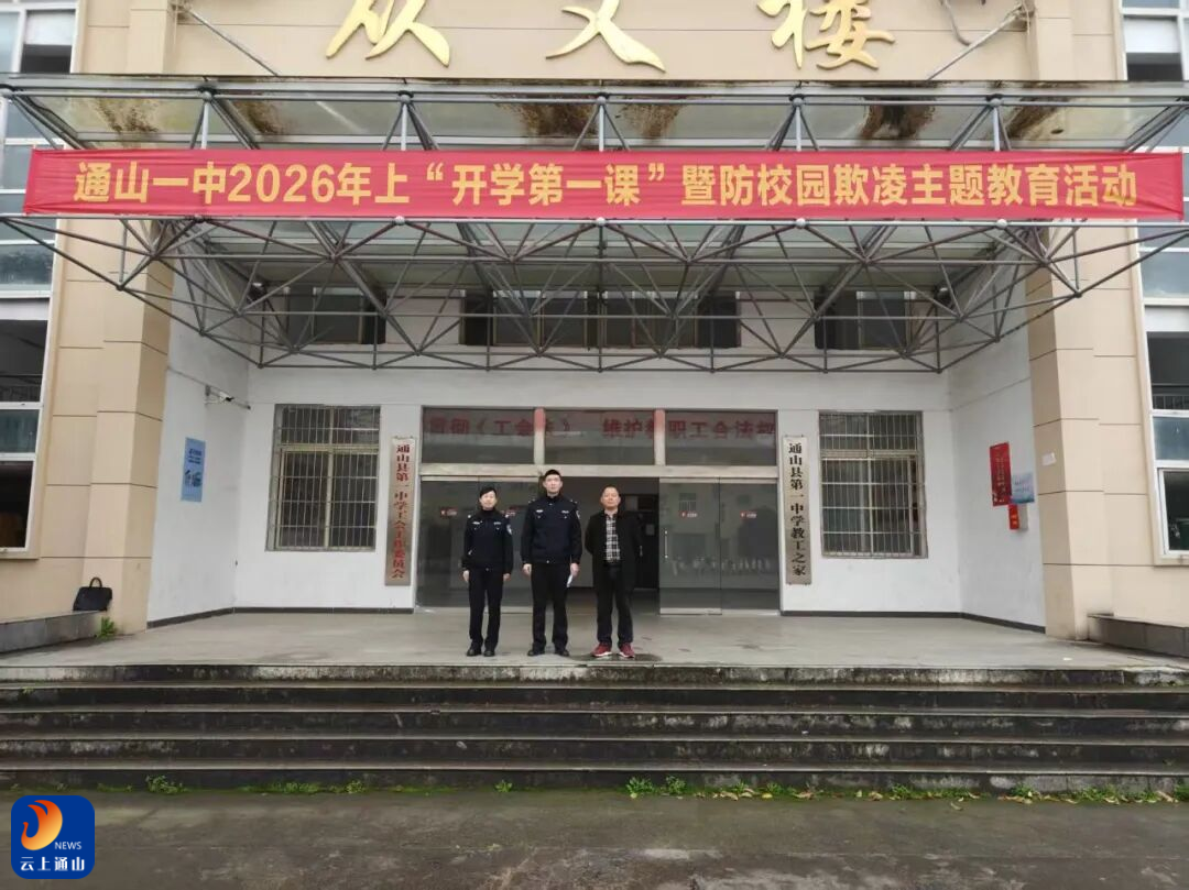 活动现场,“通山一中2026年上‘开学第一课’暨防校园欺凌主题教育活动”的红色横幅在教学楼前格外醒目,现场秩序井然、氛围庄重热烈。
