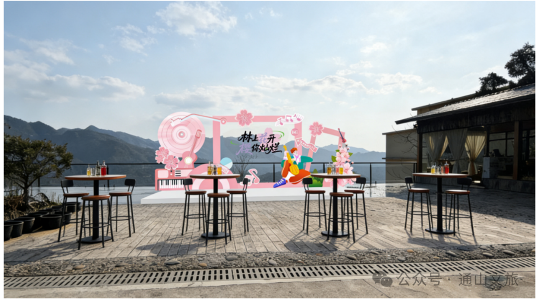 在玻璃观景台设置了小型主舞台(户外专业音响、无线麦、樱花背景、舞台地垫等)