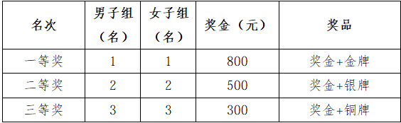 设置名次奖,根据计时成绩录取男子、女子各前6名运动员,分别获得奖金和奖牌(币种:人民币,单位:元,见下表)。