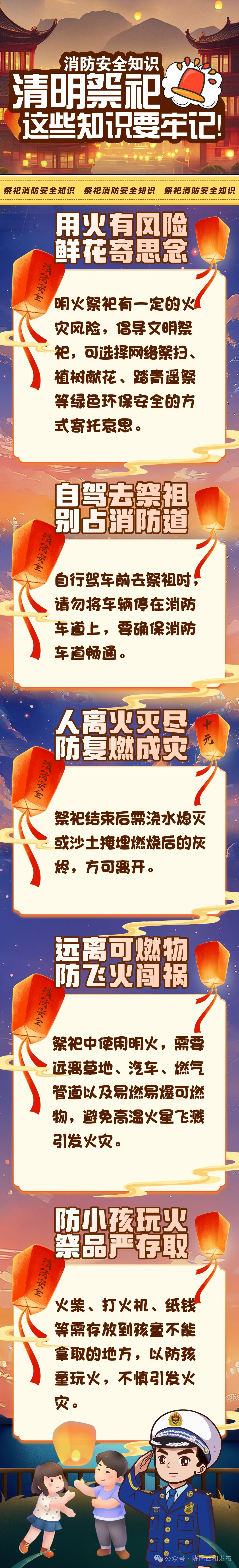 清明寄哀思,安全记心间。让我们共同摒弃祭祀用火陋习,树立文明祭祀新风,严守消防安全底线,既守护好生态环境与生命财产安全,也以安全、文明的方式缅怀先人,度过一个平安、祥和的清明节。