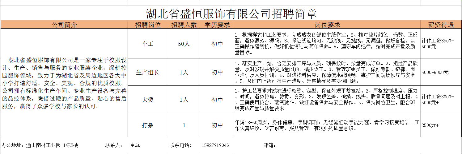 1.车工50人。学历要求:初中。岗位要求:1、根据样衣和工艺要求,完成成衣各部位车缝作业。2、核对裁片颜色、码数、正反面,避免混款、混码。3、保证线迹均匀、无跳线、无抛线、无漏缝,做好自检。4、正确操作缝纫机,做好机位清洁与简单保养。5、遵守车间纪律,按时完成产量及质量目标。薪资待遇:计件工资3500-6000元。