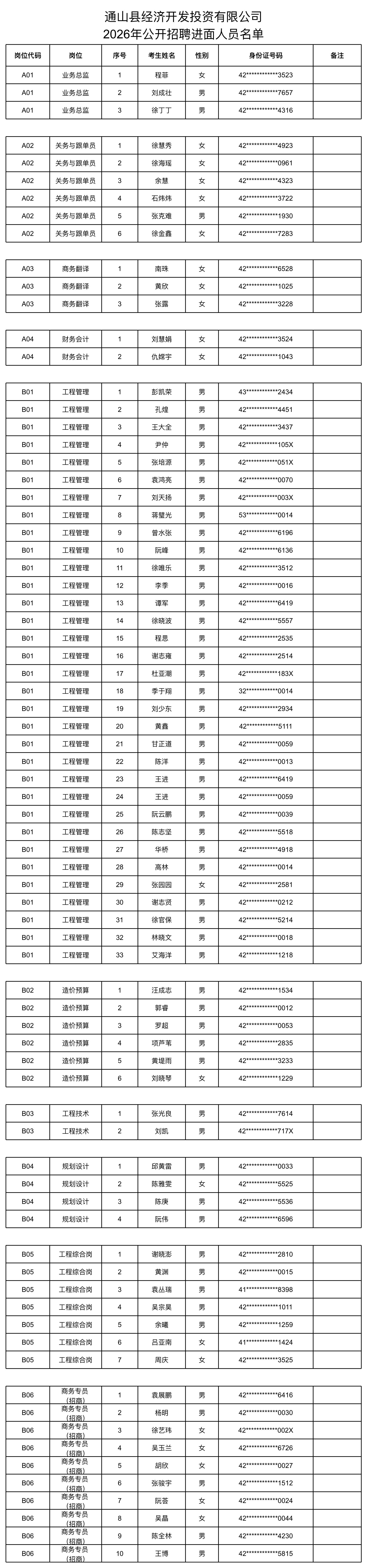 附件:通山县经济开发投资有限公司2026年公开招聘进入面试人员名单